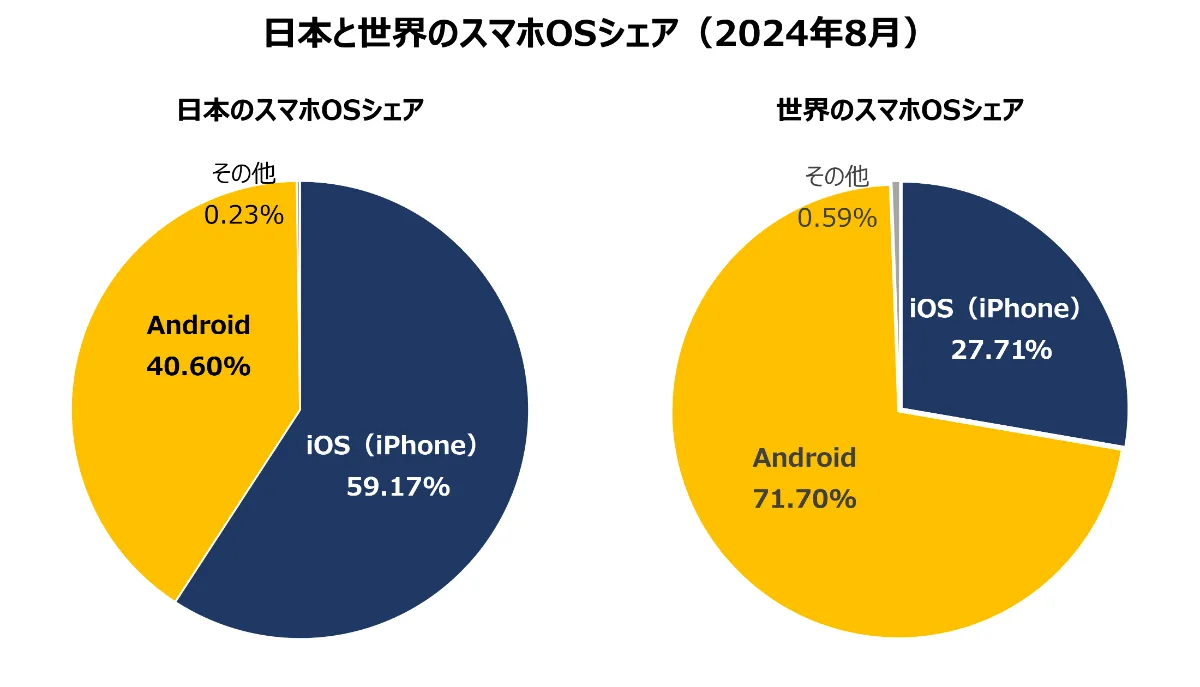 日本ではiPhoneが多いですが、海外ではandroidが大多数を占めているようです。いったいそれはなぜでしょう?それは価格が低いことや、多くのメーカーが参入できるオープンソースの仕組みがあるためだと考えられます。androidはさまざまなメーカーが独自の端末を開発し、販売しているため、サイズ、デザイン、機能など、ユーザーの自分の好みにあわせてカスタマイズすることができます。