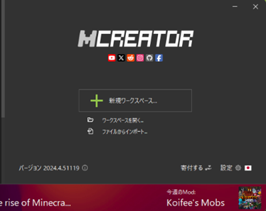 起動したら、真ん中にある新規ワークスペース…を押します(①参照)。