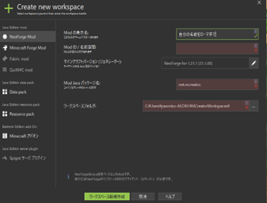 そうしたら以下の情報を記入して緑色の[ワークスペース新規作]」を押してください(②参照)。