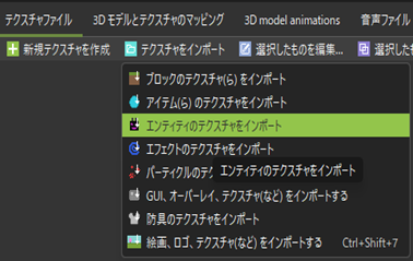 開いたら[テクスチャをインポート]を押し、[エンティティのテクスチャをインポート]を押して、先ほど作成したテクスチャで開きます(④参照)。