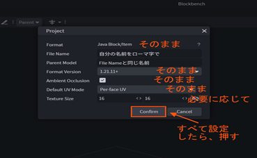 3.[Project]が出てきたら、以下の設定をして、[Confirm]を押す。