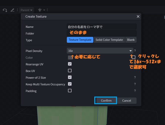 5.キャラクターの形ができたら4.で青色に囲ったところを押してください。そうすると[Create Texture]が出てくるので以下のように設定する。