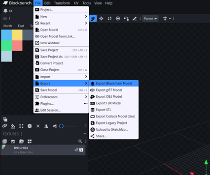 上部分にある[File]を押して[Export]にカーソルを当てて[Export Block/Item Model]を押して自分の名前で保存しましょう。